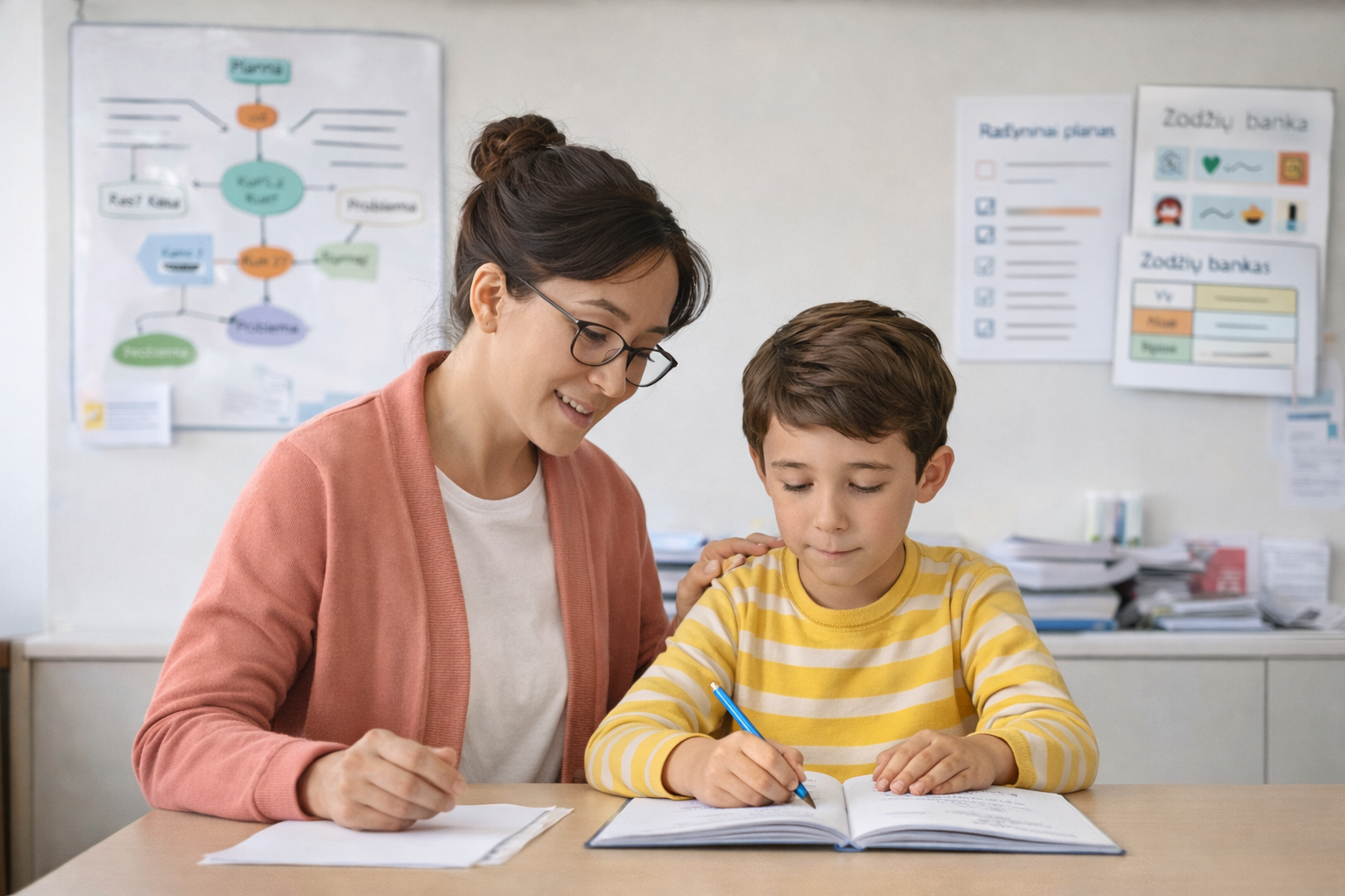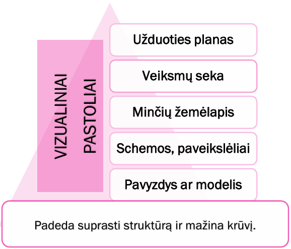 Vizualiniai pastoliai (pvz., užduoties planas, veiksmų seka, minčių žemėlapiai, schemos, paveikslėliai ar pateikiamas pavyzdys) padeda vaikui aiškiau suvokti užduoties struktūrą ir sumažina kognityvinę apkrovą, ypač dirbant su skaitymo ir rašymo sunkumais.