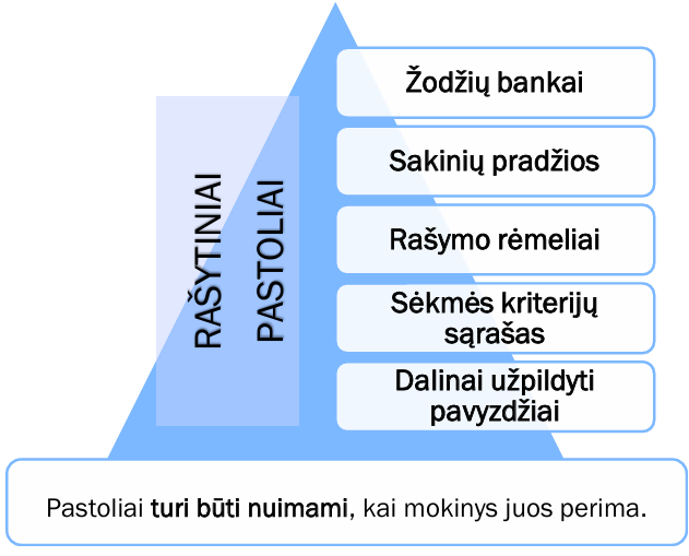 Rašytiniai pastoliai, tokie kaip žodžių bankai, sakinių pradžios, rašymo rėmeliai, sėkmės kriterijų sąrašai ar dalinai užpildyti pavyzdžiai, suteikia vaikui atramos taškus planuojant ir atliekant užduotį, kartu palaipsniui perduodant atsakomybę pačiam mokiniui.